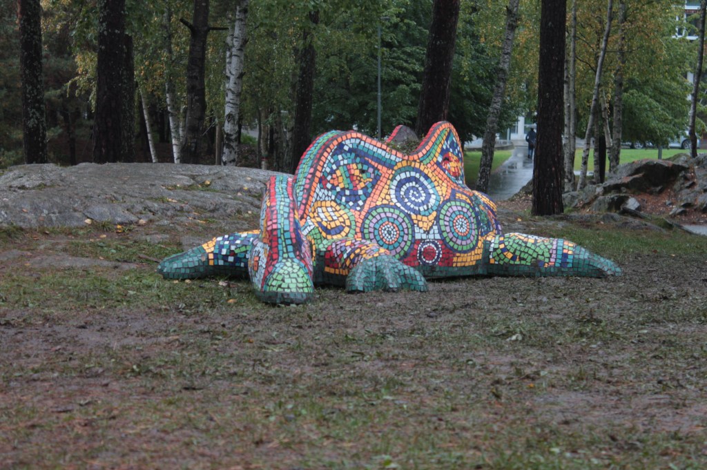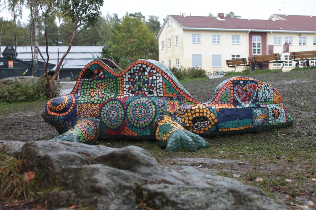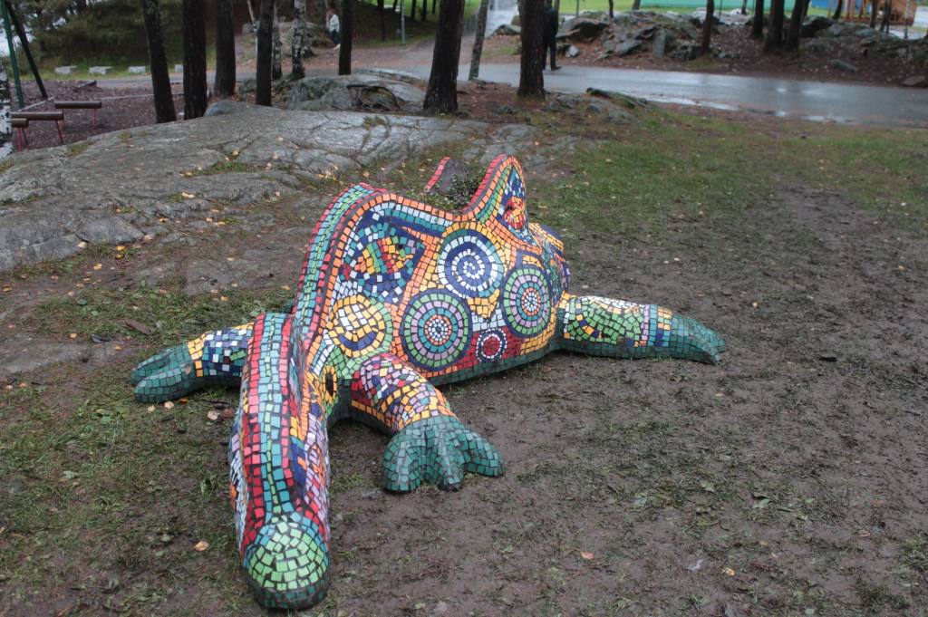 Name: «Alexander Salamander» 2024 Place: Nesodden barnskole, Nesodden, Norway Materials: Ferro cement, ceramic mosaic Dimensions: 2,60 x 1,70 x 0,60 (h) m.