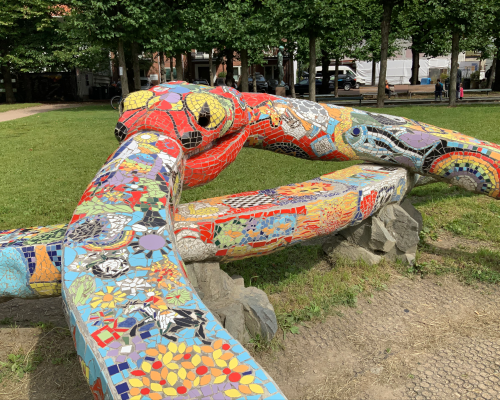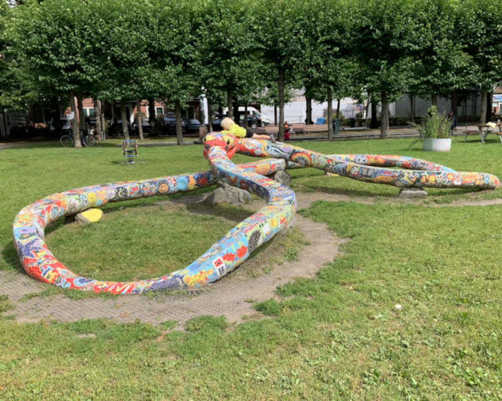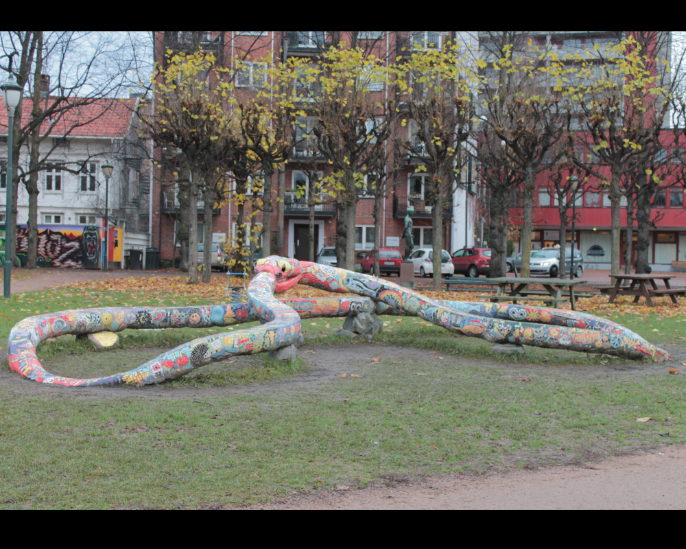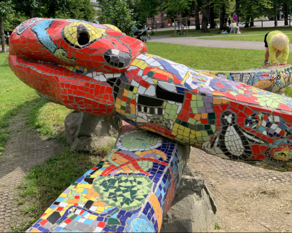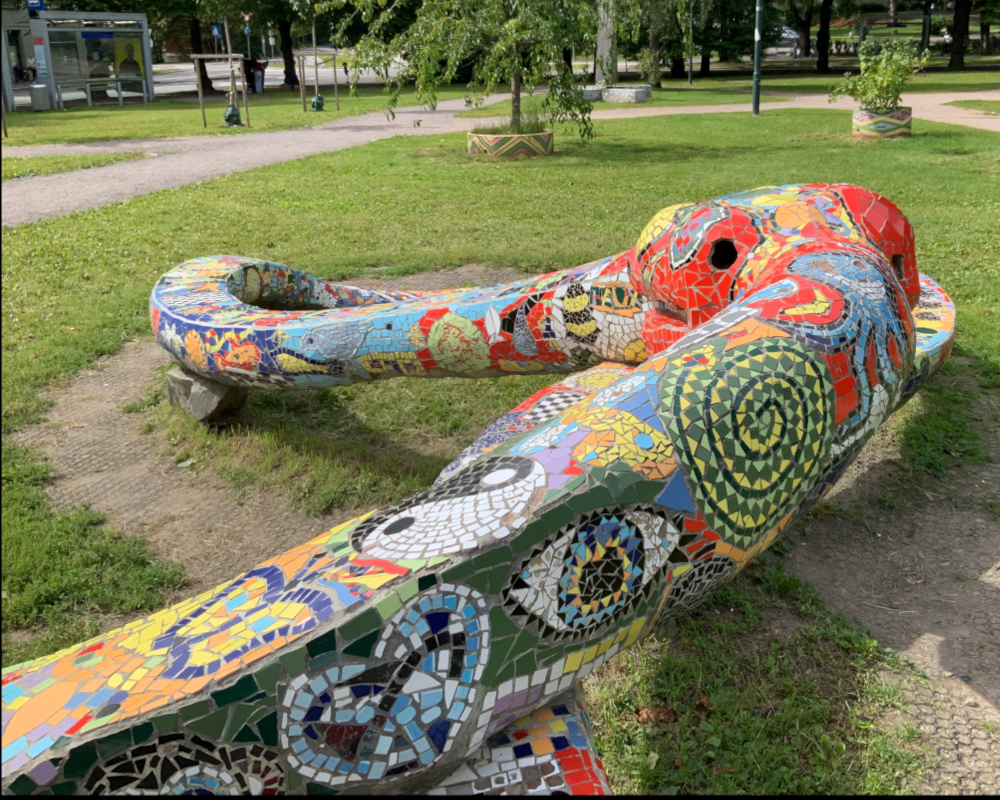Name: «7 krokodiller» (2023) Place: Urtehagen, Grønland, Oslo, Norway Materials: Ferro cement, ceramic mosaic Dimensions: Different sizes into a 11 x 4,5 m. area